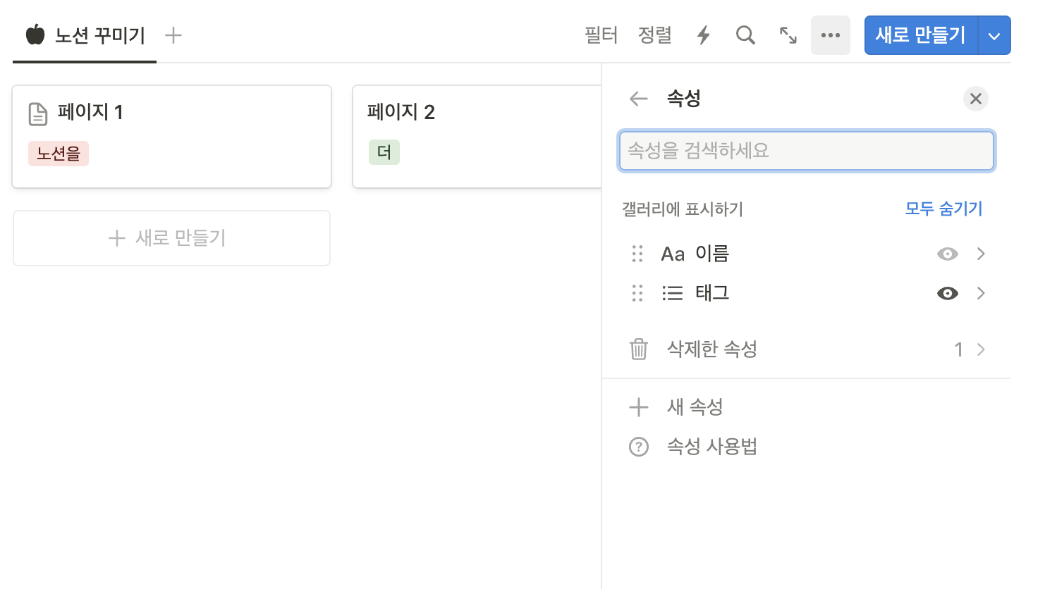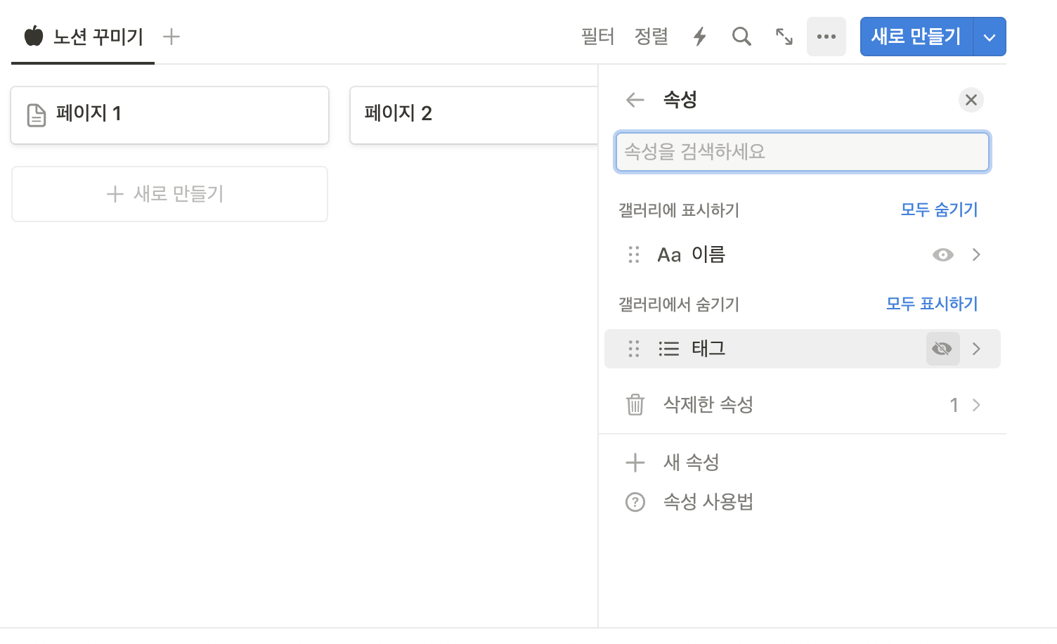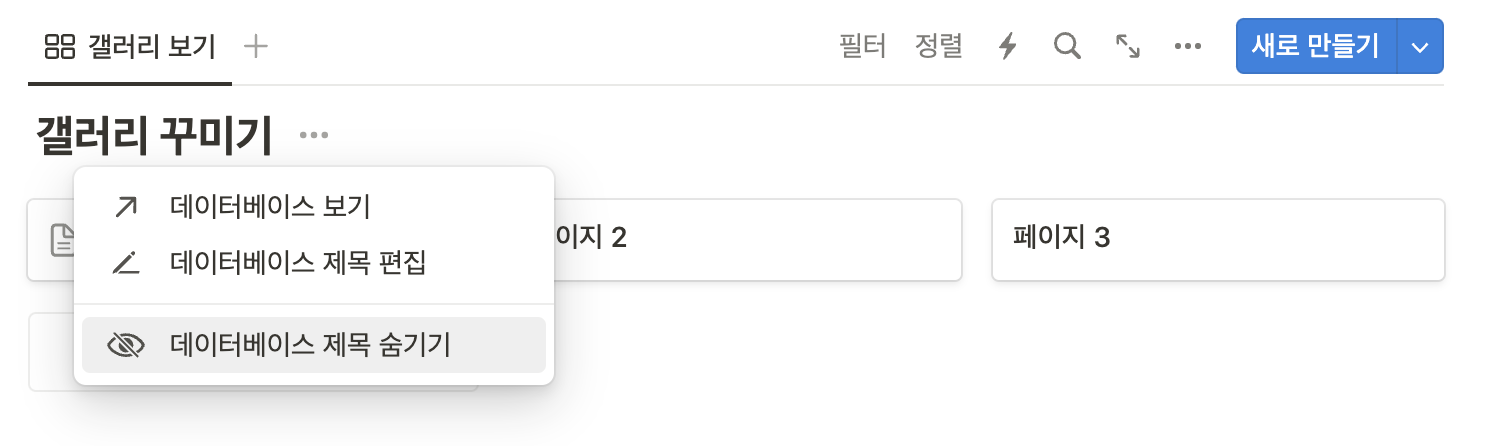 오늘은 1) 보기의 제목 숨기기, 2)'갤러리 보기'부분 변경, 3) 태그 추가하기를 알려드릴게요.