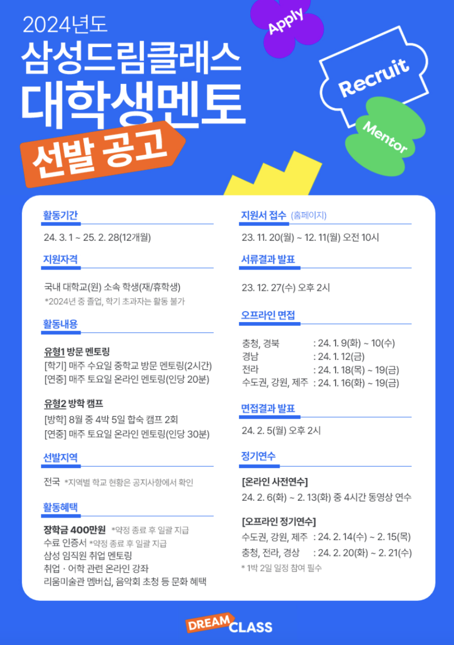 올해도 어김없이 삼성드림클래스 멘토를 모집하더라구요~!